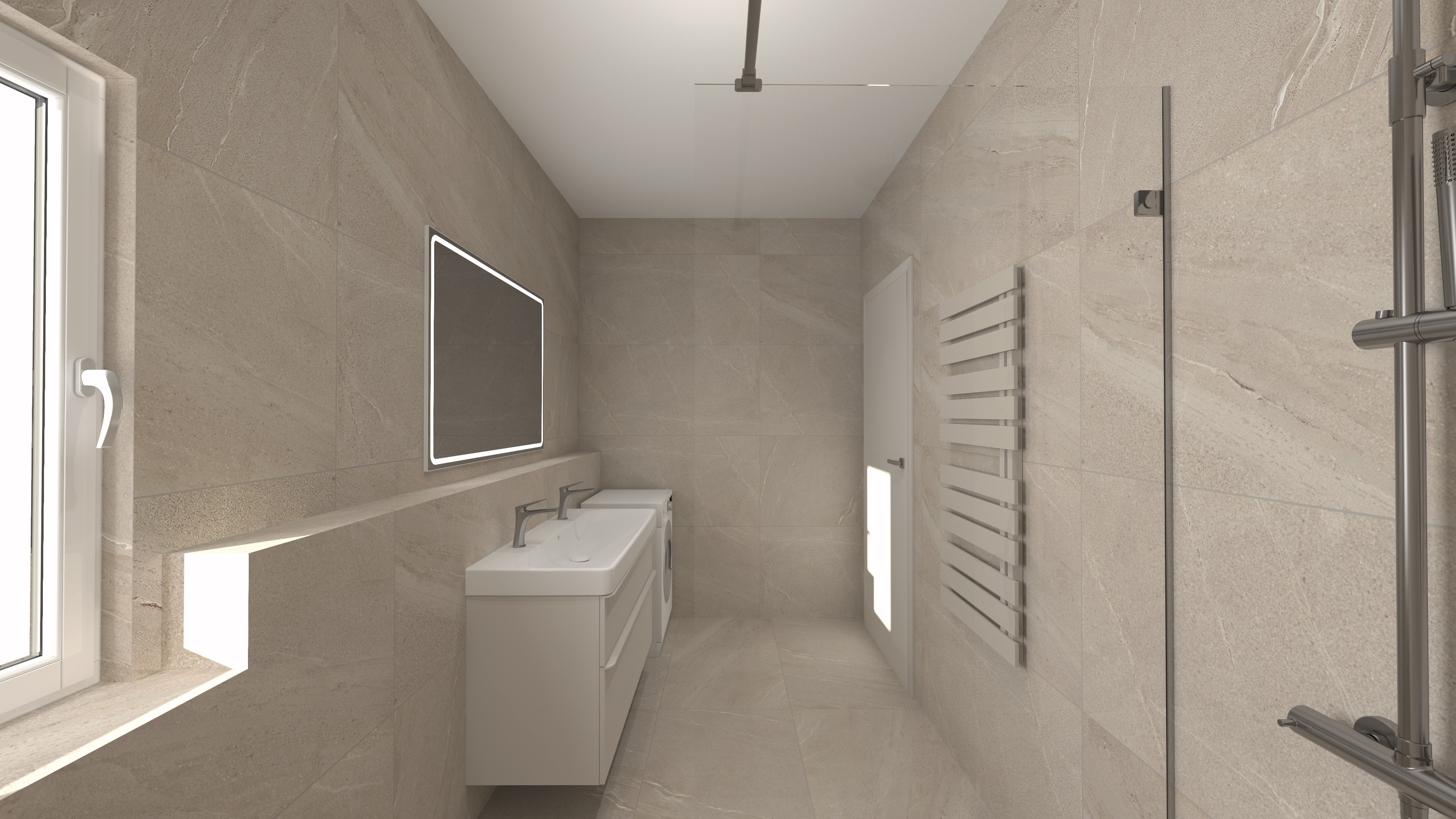 Kúpeľňa je navrhnutá v modernom minimalistickom duchu s dôrazom na funkčnosť, odolnosť a čistý vizuál. Priestor pôsobí jednotne a nadčasovo, pričom neutrálna farebnosť v zemitých tónoch vytvára príjemnú atmosféru vhodnú aj pre nájomné bývanie.